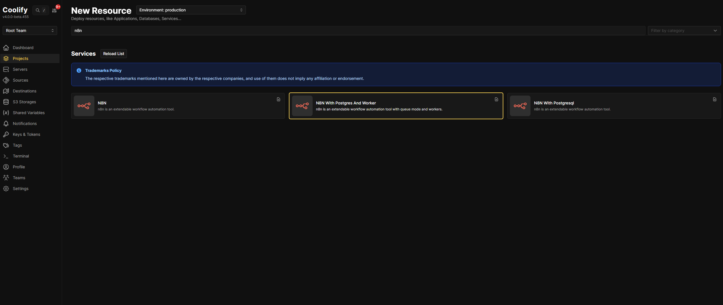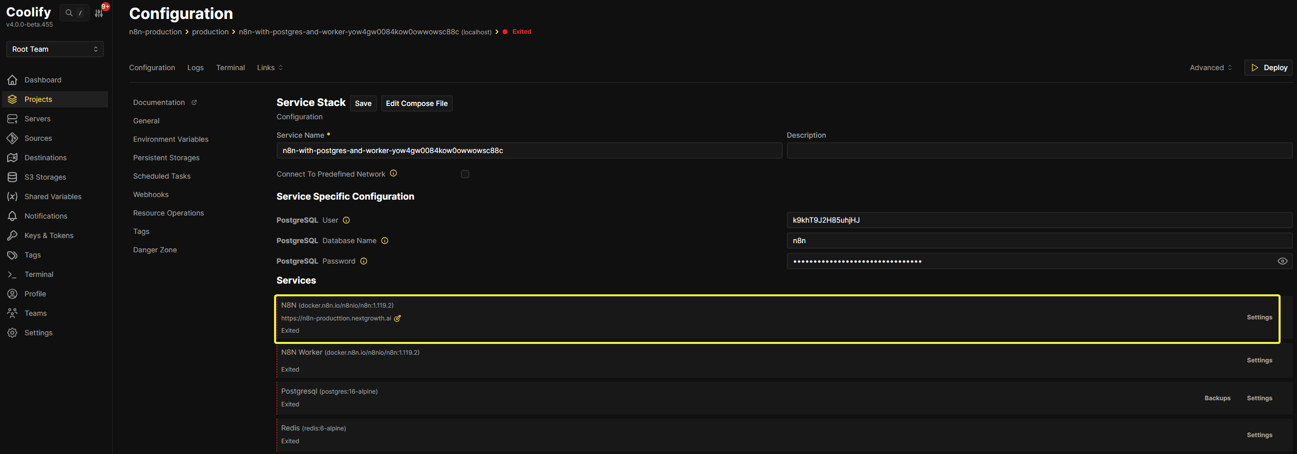 Diagram showing the core installation process of n8n through the Coolify platform.