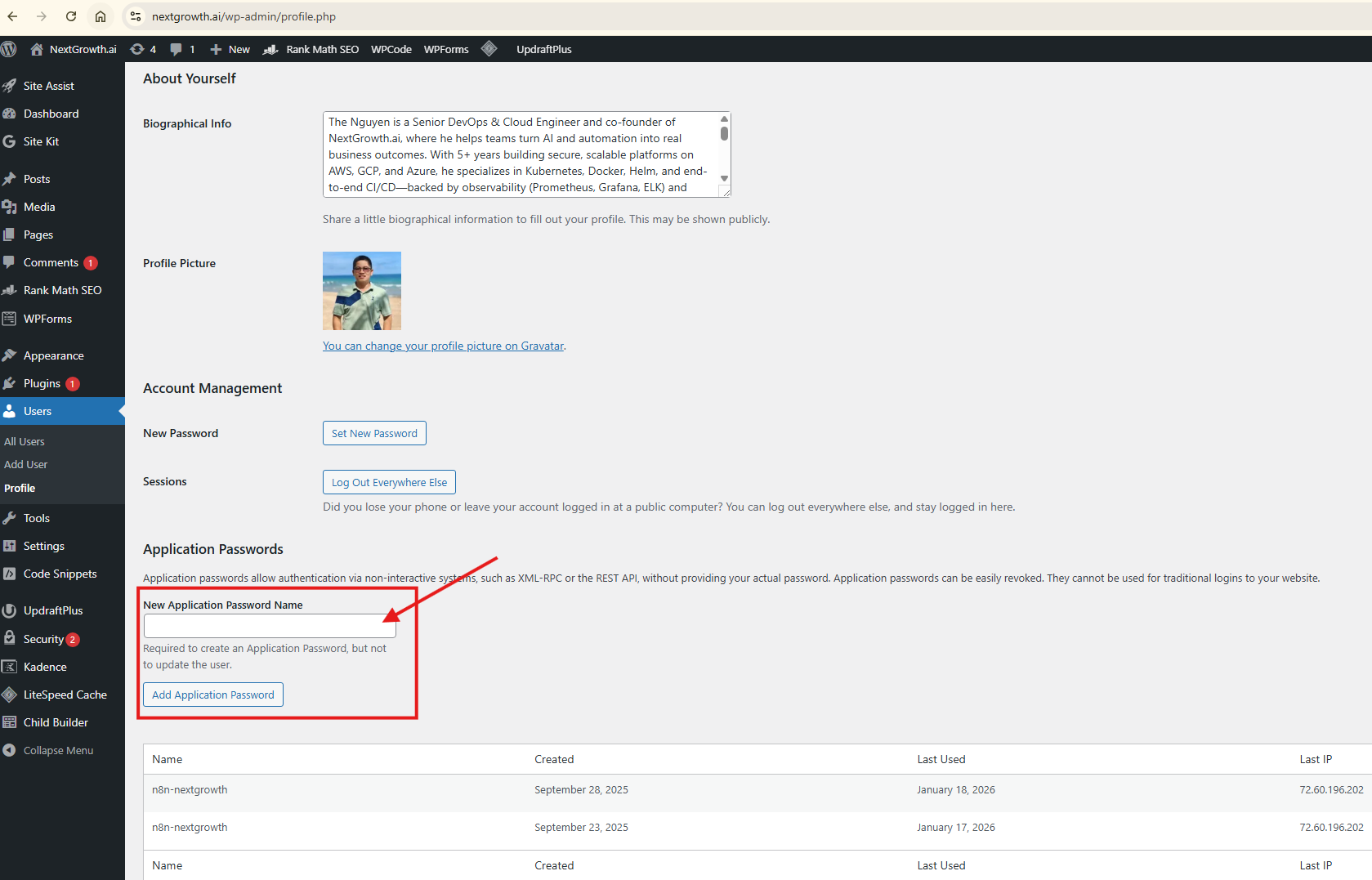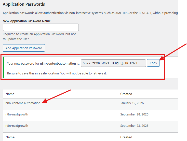 Navigate to your WordPress User Profile, scroll to the “Application Passwords” section, enter a descriptive name, and click “Add New Application Password”. WordPress will generate a 24-character key that you can use for API authentication in n8n or other tools.